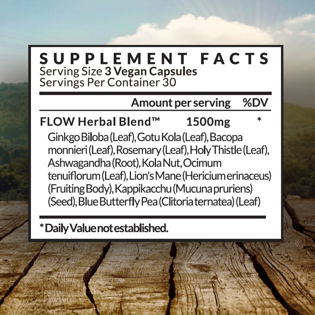 FLOW™ has a special formula of herbs and mushrooms that includes Ginkgo Biloba, Gotu Kola Leaf, Bacopa Monnieri, Rosemary Leaf, Holy Thistle, Ashwagandha Root, Kola Nut, Holy Basil Leaf, Kappi-kacchu, Blue Butterfly Pea, and Lion's Mane.